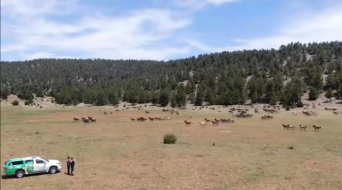Isparta Sütçüler ilçesi Zengi Yaylasında özgürce koşan yılkı atlarının güvenliği jandarma güçlerine emanet.