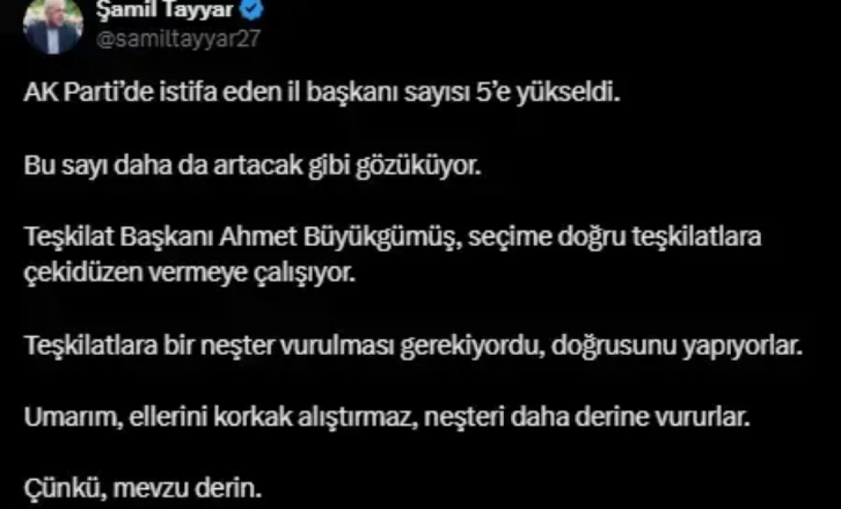 "AK Parti'de istifa eden il başkanı sayısı 5'e yükseldi. Bu sayı daha da artacak gibi gözüküyor. Teşkilat Başkanı Ahmet Büyükgümüş, seçime doğru teşkilatlara çekidüzen vermeye çalışıyor. Teşkilatlara bir neşter vurulması gerekiyordu, doğrusunu yapıyorlar. Umarım, ellerini korkak alıştırmaz, neşteri daha derine vururlar. Çünkü, mevzu derin"