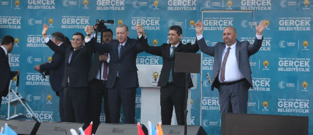 “Görüldüğü gibi sandıkta hesap verecekleri günler yaklaştıkça bunların ayakları titremeye başladı” diyen Erdoğan, “ Hangi kılığa gireceklerini, hangi yalana sarılacaklarını, hangi istikamete koşturacaklarını şaşırdılar. CHP'nin Genel Başkanı, önce İstanbul'da, Mersin'de ve kimi başka yerlerde DEM ile demlendi. İttifak yaptık. Bu iki parti aralarında yaptıkları gizli kapaklı anlaşmalarla belediye başkan adaylıklarını, meclis üyeliklerini, belediye yönetimlerini paylaştılar. Sonra da CHP Genel Başkanı çıkıp utanmadan bizim DEM’le ittifakımız yok diye demeç veriyor. Yalan bunların ağzına yuva yapmış, riyakarlık bunların karakteri haline gelmiş. Herkesi kör, alemi sersem sanıyorlar. Milletin feraset şamarı yüzlerine defalarca indiği halde bu aymazlıklarından bir türlü vazgeçmiyorlar. Ne yaparlarsa yapsınlar, nafile. Milletimiz sadece maskelerin arkasına sakladıkları gerçek yüzlerini değil, onların ciğerlerini biliyor. Bukalemun gibi renkten renge girseler de bu millet onları gördüğü her yerde tanır ve layık olduğu cevabı verir. Biz milletimize sözümüz olan eser ve hizmet siyasetine devam ediyoruz. Türkiye'nin demokrasi ve kalkınma eksiklerini telafi ettiğimiz gibi bugünkü sıkıntılarını da yine biz çözeceğiz. Ülkemizi, siyasetiyle, diplomasiyle, sanayisiyle, teknolojisiyle, tarımıyla, turizmiyle dünyanın en sıralarına nasıl taşıdıysak Türkiye Yüzyılıyla zirveye de öyle çıkaracağız. Gerisinde on yıllık zorlu bir mücadelenin bölgesel ve küresel krizin olduğu ekonomik sıkıntılarımızın çözümünde Önemli mesafe aldık Büyüme rakamları açıklandı. Türkiye geçtiğimiz yıl yüzde 4.5 oranında büyürken, milli gelirimiz ne oldu? 1,1 trilyonu ve kişi başına milli gelirimiz ne oldu, 13 bin doları aştı. Nereden nereye teşhis ettiğimiz kesintisiz büyüme ekibi sayesinde istihdamda, üretimde, ihracatta turizmde her yıl yeni rekorlar kırarak yolumuza devam ediyoruz. Tüm bunları söylerken çalışanlar ve emekliler başta olmak üzere vatandaşlarımızın yaşadıkları zorlukları asla görmezden gelmiyoruz” açıklamasını yaptı.
