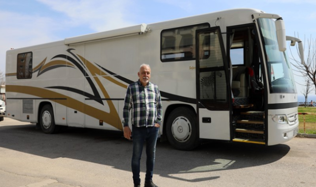 Yolcu otobüsünü karavana çeviren emekli mimar Selçuk Aslan (62), Türkiye turuna çıktı. Aslan, Akdeniz'den başladığı turda, İstanbul dışında tüm illeri gezeceğini söyledi.
