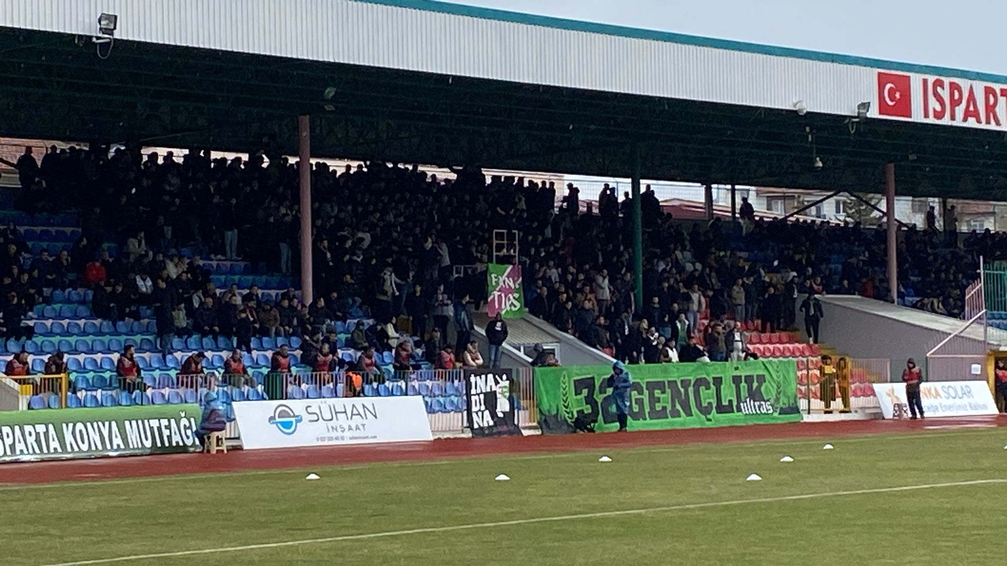 Isbaş Isparta 32 Spor-Bursaspor mücadelesi öncesinde Bursa taraftarları ile Isparta taraftarları birbirine Isparta-Bursa kardeştir el ele 1. Lige sloganları ile centilmenlik gösterisi yaptı.