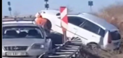 Otomobil bariyerde asılı kaldı